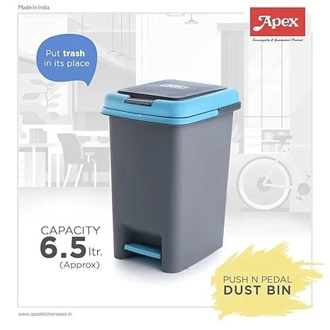 Apex Presenting a Modern Blue And Grey Push and Pedal Dustbin for Home and Offices . Bins are made of high quality plastic. It can be used for both dry and wet waste. They can be easily used in bathroom, bedrooms, balcony, kitchen and offices. The modern designs suits well with all kind of decor. Bins are available in different sizes and designs. on floor caused Common rooms, bathrooms bedrooms, under the desk are common usage areas now a day’s steel dustbins are in used in every home. Dustbins can be lined with plastic or paper garbage covers of any size. Wipe clean with a damp cloth. Do not use any bleach or acidic cleaners. Push and pedal dustbin it is a pedal bin and is foot operated. Just press on the pedal and it will open.