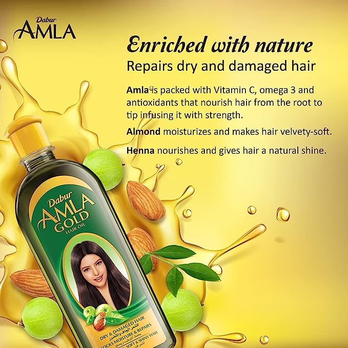 • DIRECTIONS FOR USE: Use your fingertips to gently massage the scalp and hair with Dabur Amla Gold Hair Oil and leave it in for some time (ideally 1 hour). Then apply a good shampoo, such as Vatika’s Ayurveda range of shampoos. Massage the shampoo well into the hair and scalp and rinse thoroughly, followed by our conditioner. Apply Dabur Amla Gold Hair Oil three times a week. For optimal results, use our premium range of Vatika Ayurveda products.