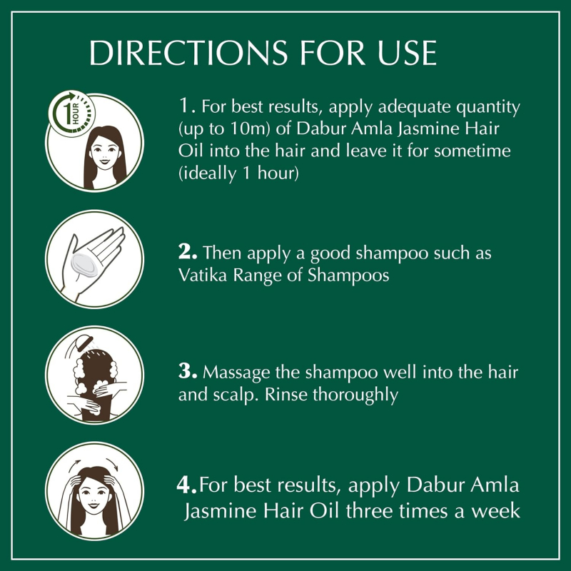 For best results, apply an adequate quantity (up to 10 ml) of Dabur Amla Jasmine Hair Oil into the hair and leave it for some time (ideally 1 hour).