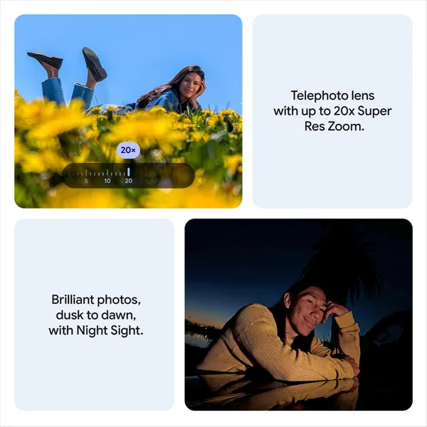 Pixel 10 has an all-new 5x telephoto lens with 10x optical image quality and up to 20x Super Res Zoom for capturing incredibly sharp closeups from a distance.