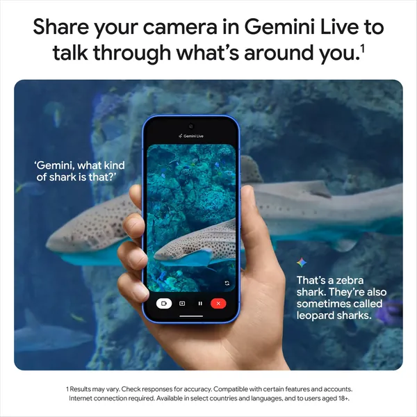 Share your camera in Gemini Live conversations to have a live back-and-forth chat with Gemini about what you’re seeing.14 Show your living room to get help rearranging it. Show your pantry to get dinner ideas using those ingredients. Or show your wardrobe to get styling tips.