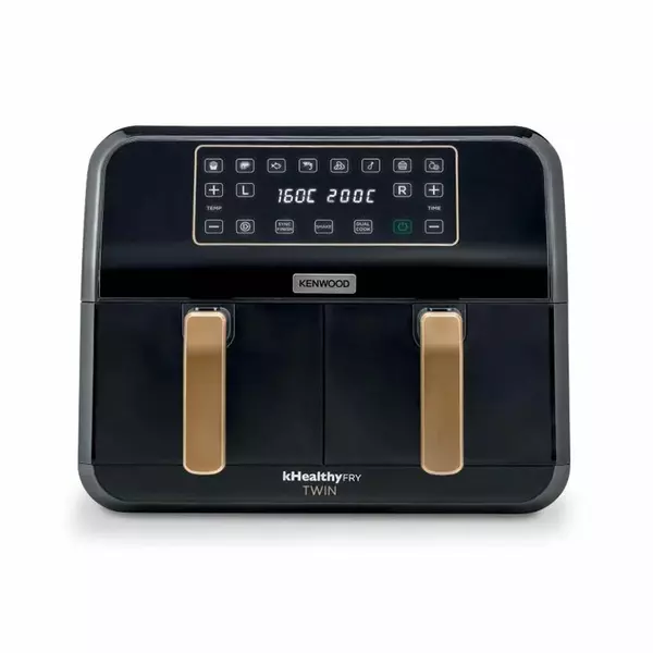 Kenwood Digital Twin Air Fryer 4L+4L 1.7KG+1.7KG with Dual Zone Technology & Dual Frying Baskets for Frying, Grilling, Broiling, Roasting, Baking, Toasting & Reheating HFP70.000BK Black/Gold. Two zones become one ideal for large quantities, rapid air circulation, less 80% fat than traditional fryers, Adjustable Temperature 35 -200 degree, with 2 crisper trays included for rapid air circulation, adjustable Temperature 35 -200 degree.
