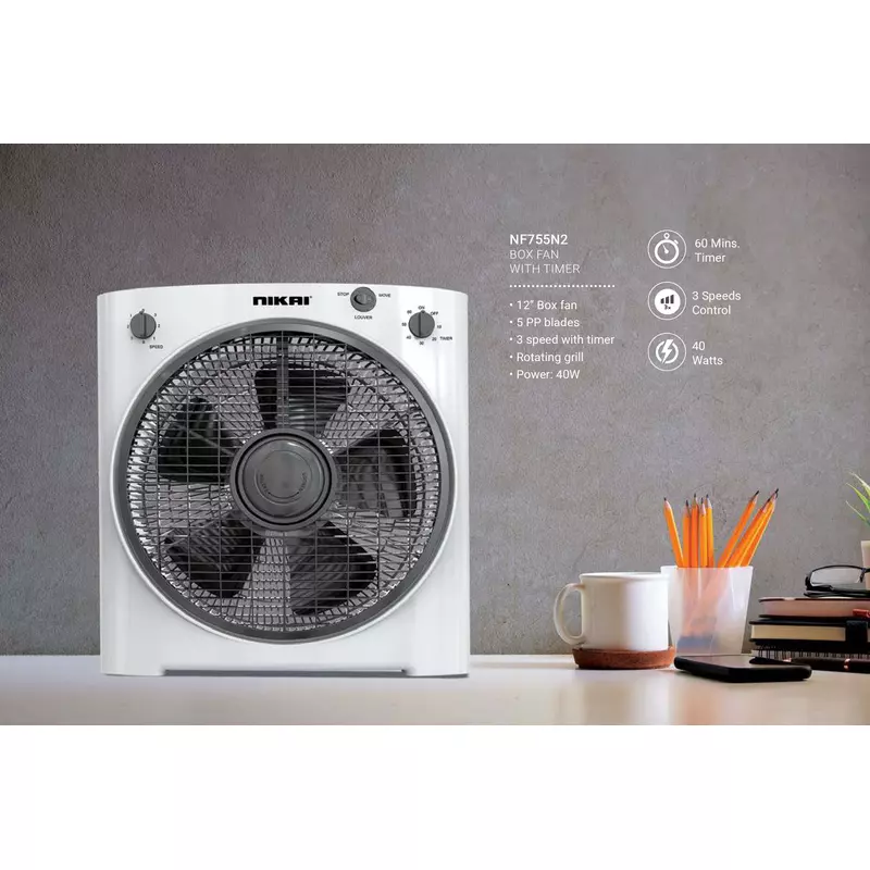 Nikai Box Fan 12Inch With Rotating Grill 40W Nf755N2 60 Mins Timer 5 Pp Blades 3 Speeds Control