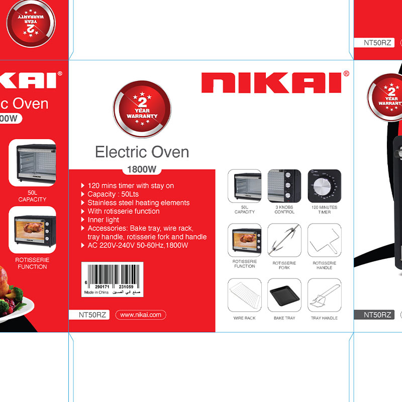Nikai Oven Electric 50L With Rosting Function 1800W NT50RZ 120 Mins Timer Single Glass Panel Stainless Steel Heating Elements Inner Light