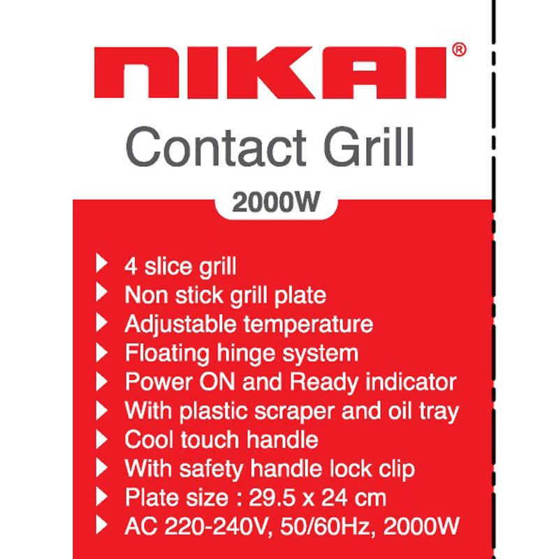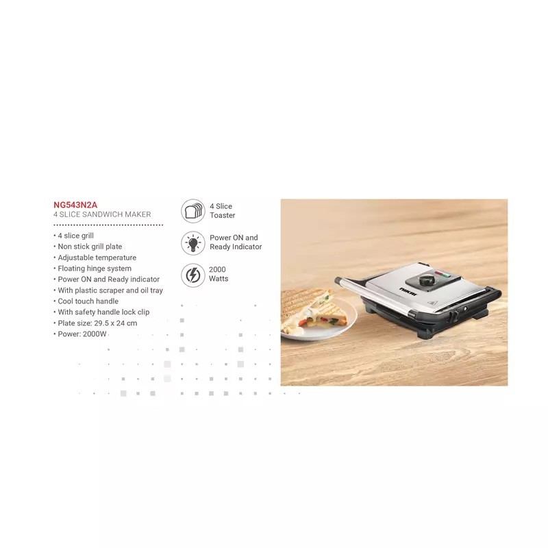 Nikai Sandwich Toaster 4 Slice 29.5X24Cm 2000W NG543N2A Non Stick Grill Plate Adjustable Temperature Light Indicator Cool Touch