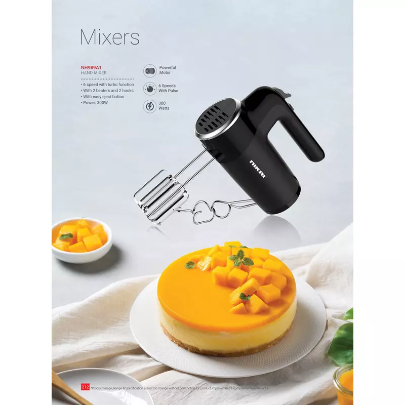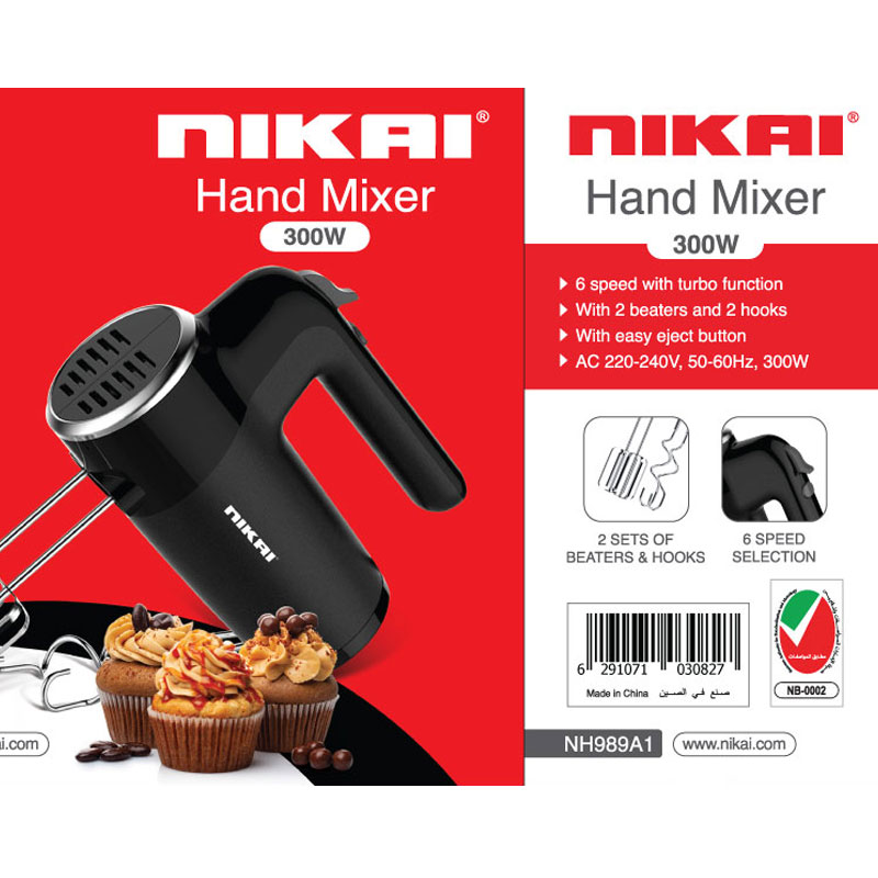 Nikai Hand Mixer 6 Speeds With Turbo Function 300W NH989A1 2 Beaters For Eggs And Cream And 2 Hooks For Mixing Dough With Easy Eject Button