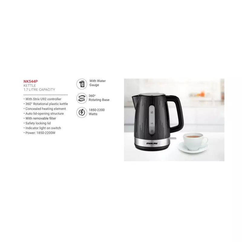 Nikai Jug Kettle 1.7L Plastic With Water Guage 2200W NK544P Removable Filter With Water Guage Indicator Light On Switch With Strix U29 Controller
