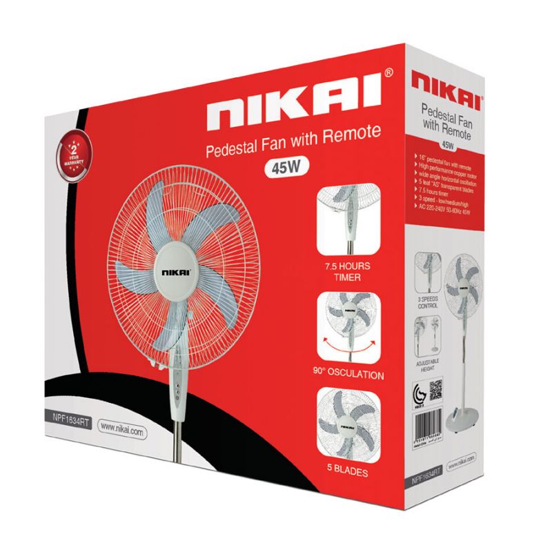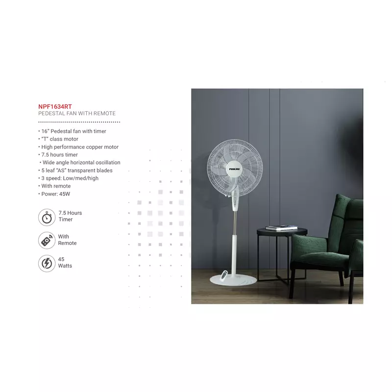 Nikai Stand Fan 16 inch Padestal Fan W/remote 45w NPF1634RT 7.5 Hours Timer High Performance Copper Motor 3 Speeds Low, Medium And High