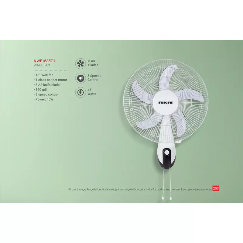 Nikai Wall Fan 16 Inch 5 Blades 3 Speeds 45W NWF1635T1 T Class Copper Motor 120 Grill 5 As Knife Blades