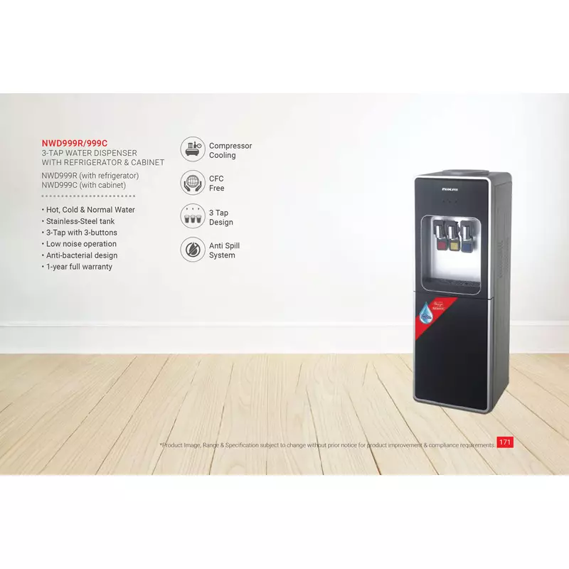 Nikai Water Dispenser 3 Taps Top Load With Refrigerator NWD999R 3 Taps Hot Normal And Cold Compressor Cooling Steel Tank Anti Bacterial Design