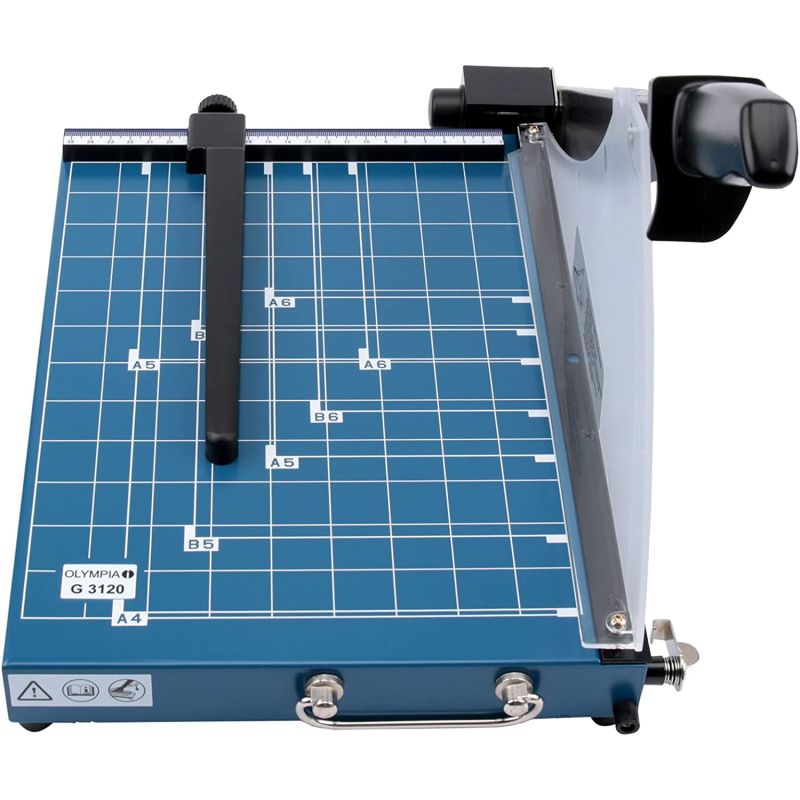 An office-type model, the Olympia G3120 professional A4 arm guillotine machine has a self-sharpening blade system. The steel sword, which is made of special metal mixture, can cut up to 20 pieces of paper at a time. This model, which can adjust the required tightness itself, can make smooth, sharp and clear cuts. In addition, it has a protection that has been developed to prevent hand and finger injuries.