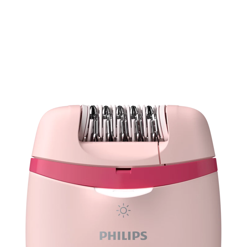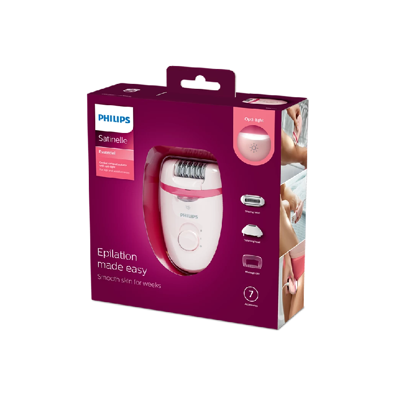 Philips Satinelle Essential Corded Compact Epilator with 7 Accessories, Exfoliation Glove & Carry Pouch, Opti-Light for Legs, Arms & Underarms BRE285
