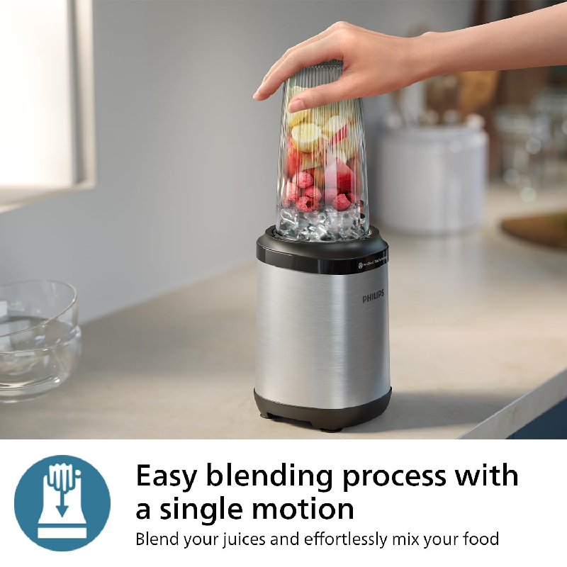 Blend and go with the handy 700 ml tumbler. Make your daily smoothie, then pop on a leak-proof lid to take it with you. Or store it in the fridge for later. The tumbler is made with Tritan from Eastman, it is 100% BPA free, shatter-resistant, and dishwasher-safe.