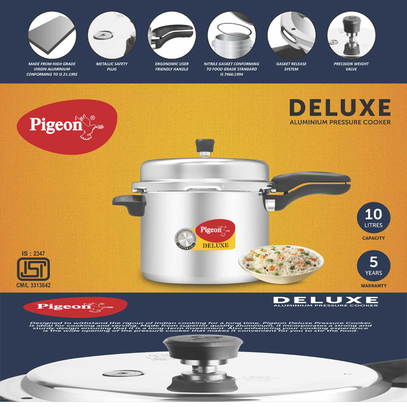 Pigeon Pressure Cooker 10l Deluxe Outer Lid Aluminium Sap 105 – Ergonomic Sturdy Handle Thermal Efficiency Special Alloy Safety Plug
