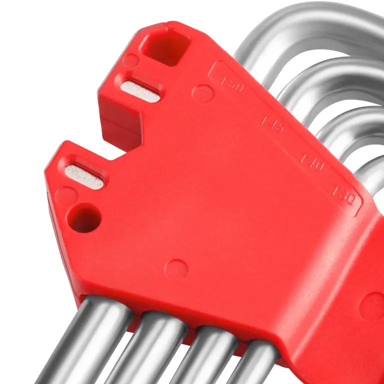 The Ronix RH-2036 9-Piece Long Arm Torx Key Set offers reliable performance with a chrome vanadium shaft that has a matte surface finish for durability and wear resistance. The tip of this tool is worked for greater tolerance and durability. The set also includes a modern soft PVC holder for safe storage and easy access. Due to its small volume and dimensions, this tool is easy to carry for the user. In addition, this kit comes with a magnetizer, allowing users to magnetize the keys for better handling of small screws and bolts.