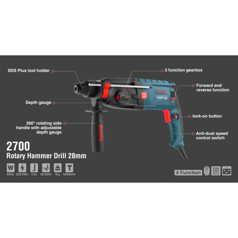 Ronix 2700 Rotary Hammer Drill comes in a Ronix BMC case, including a scale bar, extra carbon brush, (1)SDS plus drill bit 7*150, (1)SDS plus drill bit 8*150,(1) SDS plus drill bit 10*150, (1)SDS plus drill bit 12*200, and auxiliary Ronix-designed handle.