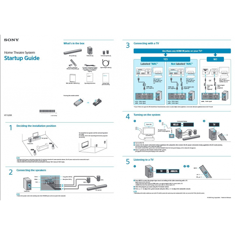 The HT-S20R is almost ready to go straight out of the box. Simply plug it in, wire up your main bar speaker and rear speakers via colour-coded connections, position your wired subwoofer and rear speakers, and enjoy 5.1 channels of real surround sound.