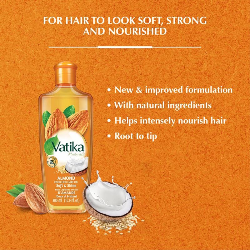Vatika Almonds Hair Oil contains the nourishing extracts of Almond, Sesame and Coconut Oil. The unique formulation helps soften, moisturise and condition the hair, giving your hair silky softness and shine.